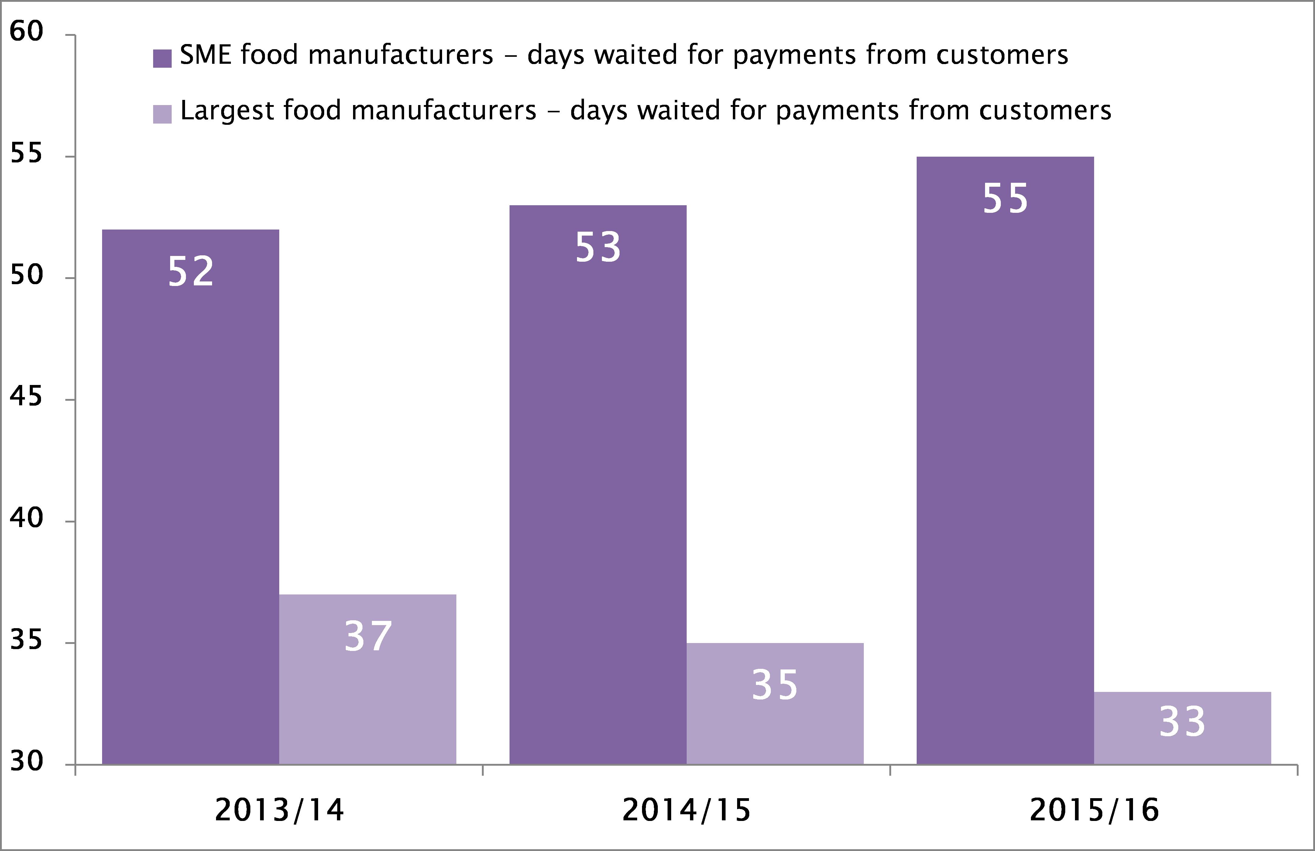 SME food manufacturers now face waits of 55 days (or nearly 8 weeks) for their invoices to be paid, two-thirds longer than the 33 days (or nearly 5 weeks) their larger competitors wait.